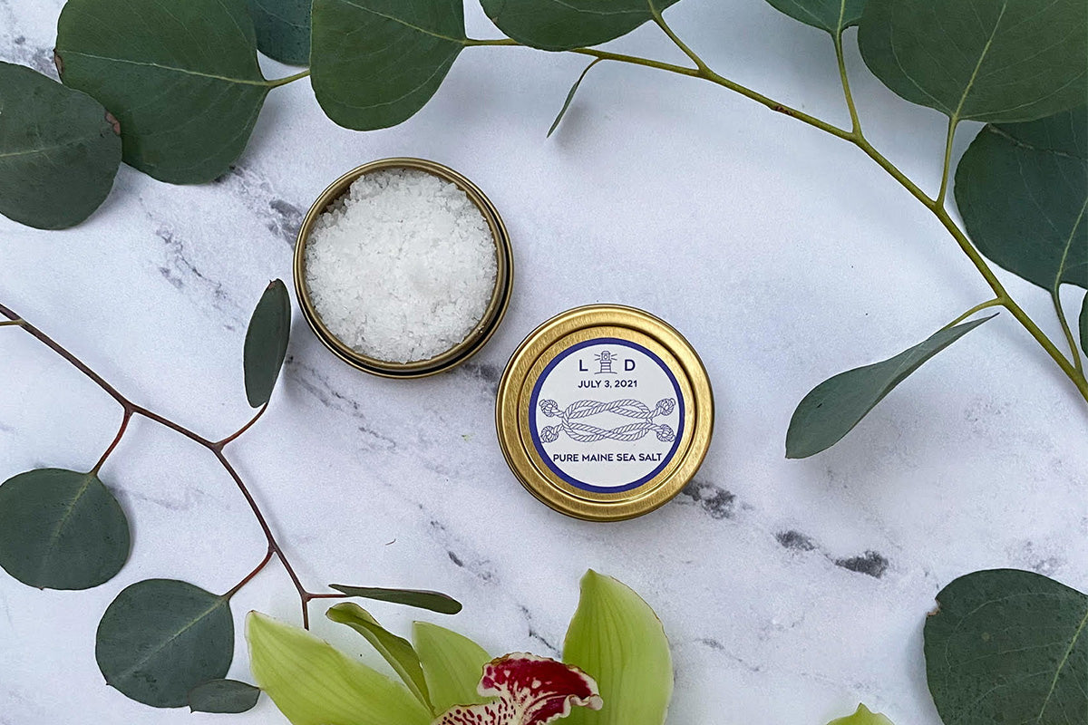 If you're looking for a beautiful favor for your guests, look no further than our hand crafted sea salt. We will work with you to personalize tins of sea salt with anything from art from your wedding invites to your initials and date for a custom gift your guests will love.